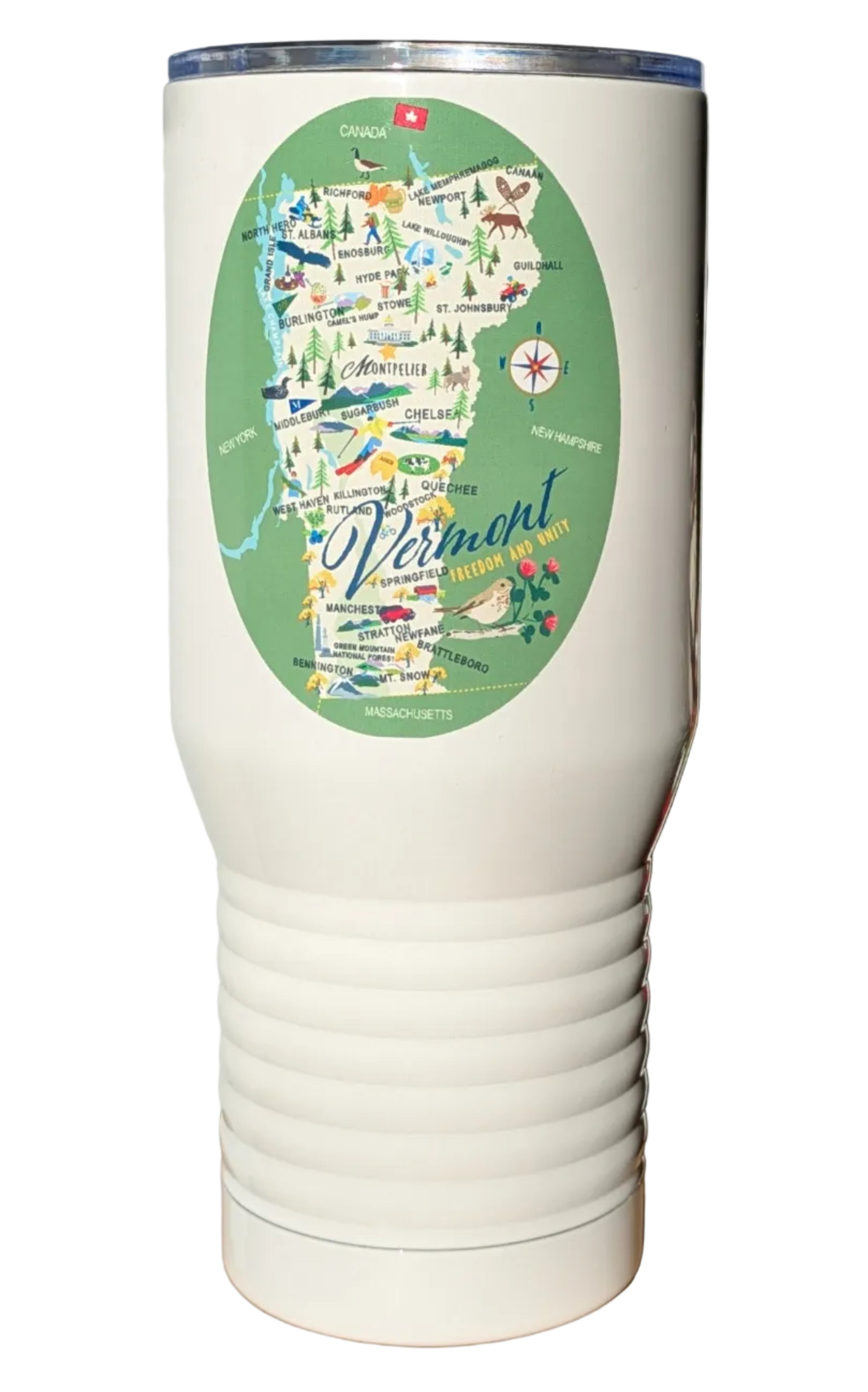 This 20 oz tumbler features a whimsical map of Vermont, highlighting some of our favorite destinations. Suitable for hot or cold drinks. Straw not included.