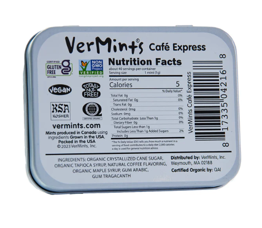 VerMints were created in Bellows Falls, Vermont, with the mission of crafting a pure and true mint, full of flavor with no unnecessary additives. VerMints are made with 100% natural and organic ingredients and contain no animal products or artificial flavors, sweeteners, or colors.