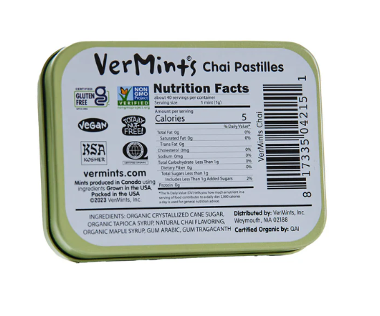 VerMints were created in Bellows Falls, Vermont, with the mission of crafting a pure and true mint, full of flavor with no unnecessary additives. VerMints are made with 100% natural and organic ingredients and contain no animal products or artificial flavors, sweeteners, or colors.