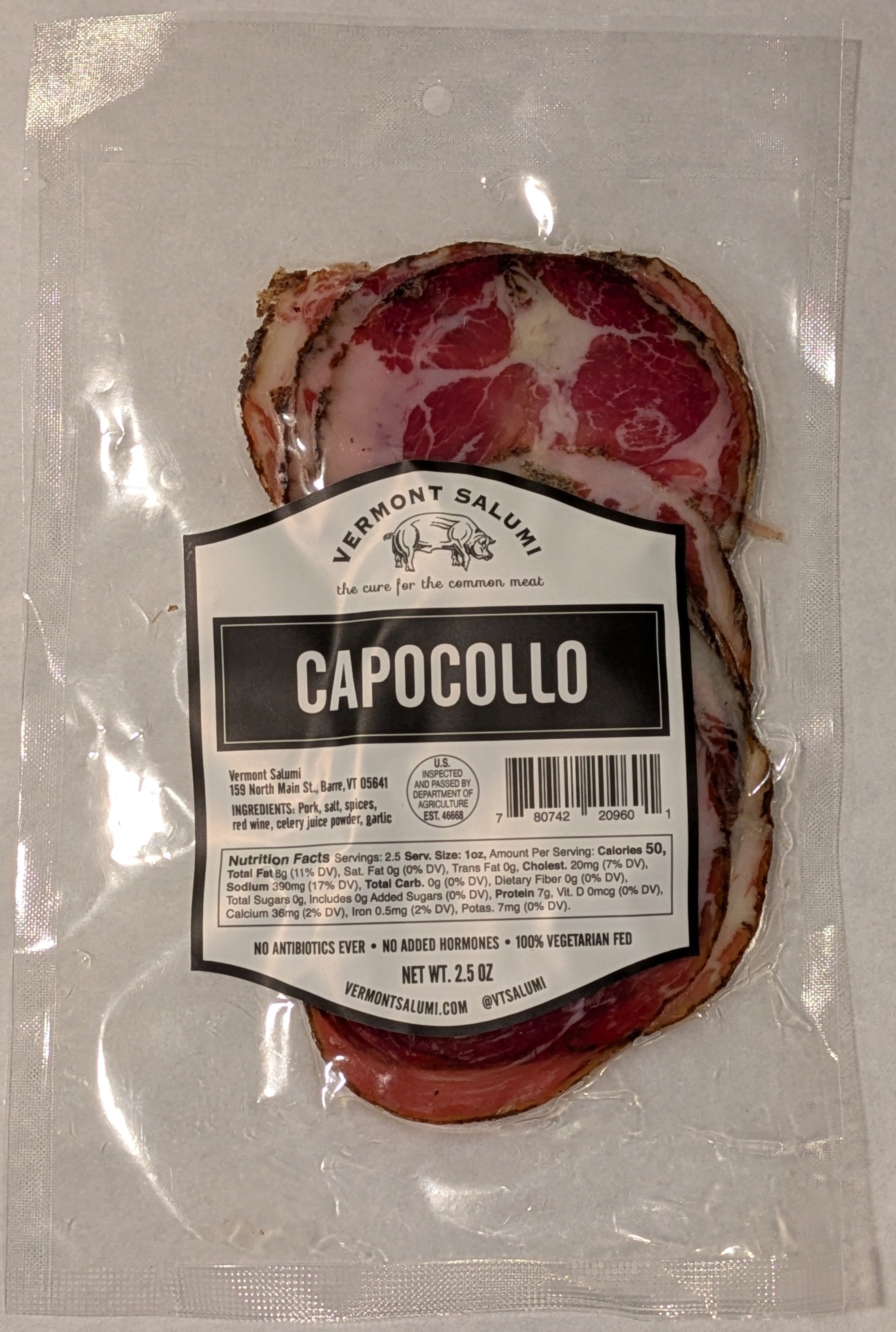 Vermont Salumi Capocollo is made from pork shoulder seasoned with black pepper, garlic, and coriander and cured for 2 months. Contains NO added nitrates or nitrites. Perfect on a charcuterie board with cheese, olives, and our Stowe Mercantile crackers!