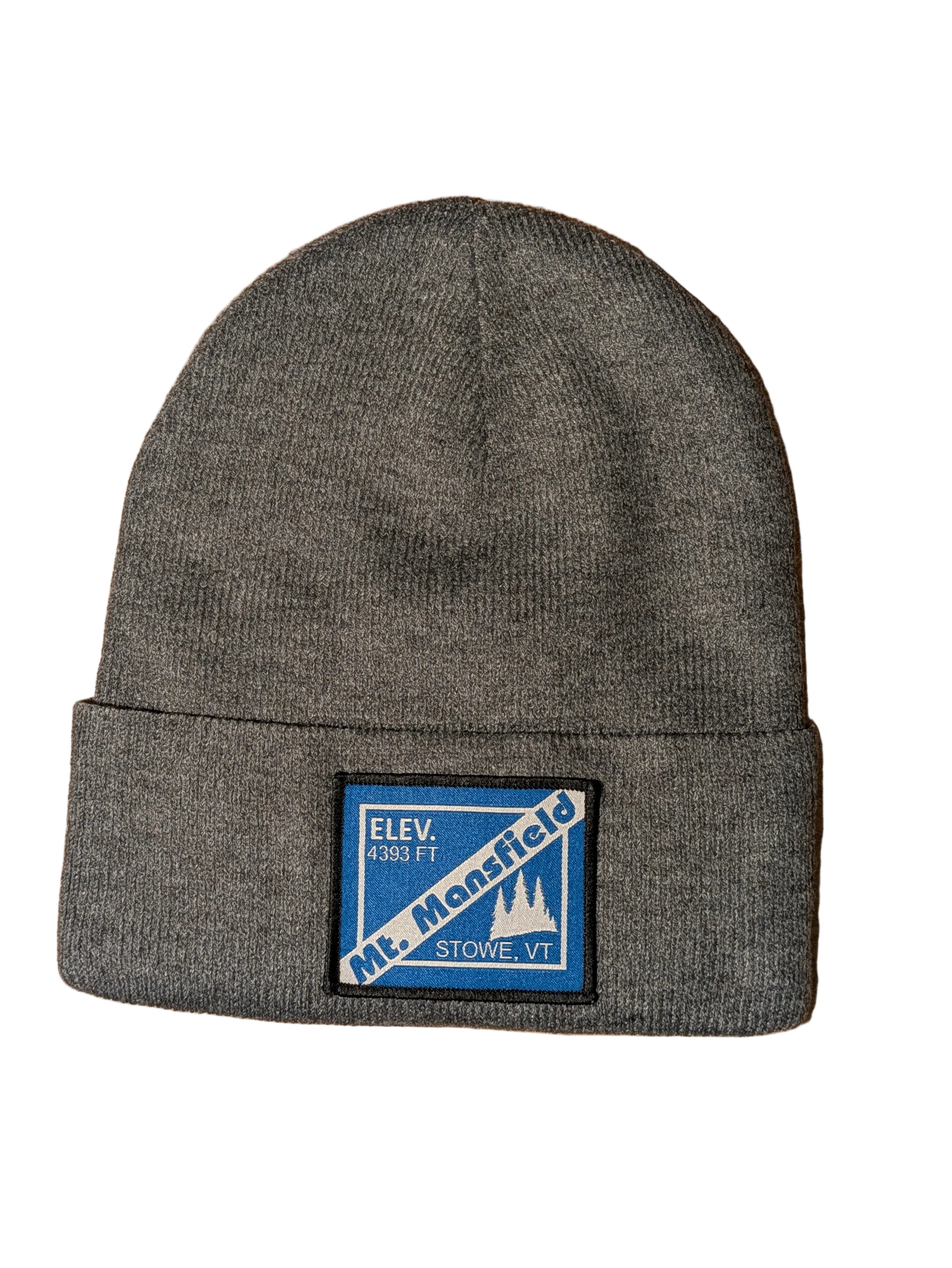 A cuffed gray beanie hat with a Mt. Mansfield patch. Designed in-house.