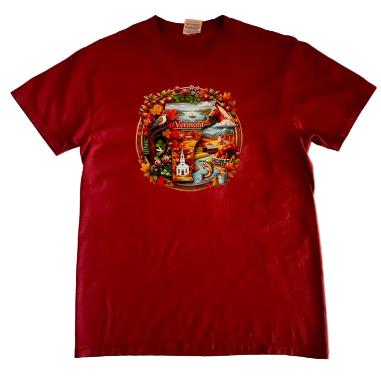 Folk art Vermont "freedom and unity" T-shirt. Designed and printed in-house by our family.